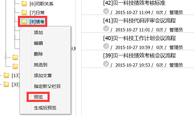 第二:需預覽文章對應欄目,操作步驟選中新添加文章對應的欄目后右鍵選擇“預覽”,文章所屬欄目預覽成功。如下圖中,新文章屬“績考”欄目,則選中績考右鍵選擇“預覽”。